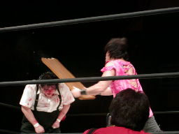 GENTAROは机の破片で蛇ダーと金村を連打(右写真)、カバー、カウント2。GENTAROバックドロップホールド、カウント2。
