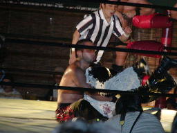 橋本ロープに振ってエルボー、首を固める。これがスバーン・クランクだったっけ?違うかも。橋本十字に移行(左写真)、MIKAMIロープ。橋本は佐々木にタッチ。