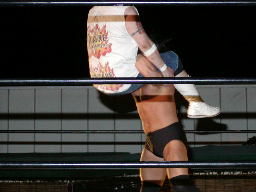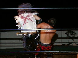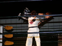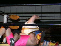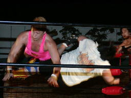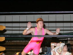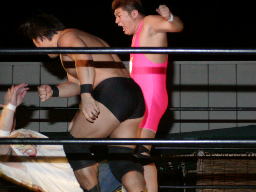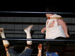 太ロープに飛んで金村をショルダーブロックで吹っ飛ばす(右写真)。太コーナーに上って「フライングラリアット!」しかし金村とは距離ありすぎ。太コーナー降りて走ってラリアット、金村難なくキャッチするとワキ固め、太高速ギブアップ。