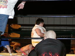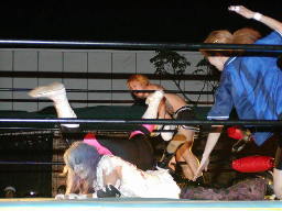 MIKAMIがボディスラム、鳥羽がコーナーから「ウィーン」と急降下。監獄固めに取ってボディにパンチ連打(右写真)。GENTAROロープ。鳥羽は怨霊にタッチ。5分経過。