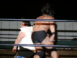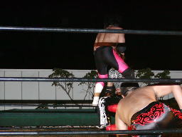 MIKAMI首投げ、コーナーに上る、GENTAROが妨害し雪崩式フランケンに(左写真)。