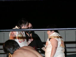 鳥羽がGENTAROにカカト落とし、怨霊が怨霊クラッチ(左写真)、佐々木がカット。怨霊ロープに振ってコルバタ、GENTARO場外転落。怨霊はトップロープに飛び乗ってスワンダイブトペコン。MIKAMIと橋本がリングに。