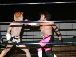GENTAROロープに振ってキチンシンク、「満員御礼」と言うとエルボードロップ。GENTAROパンチ連打からディスカスパンチ、鳥羽ブロック。GENTAROまたパンチからディスカスパンチ、鳥羽ブロックして逆にパンチ(左写真)、怨霊にタッチ。10分経過。