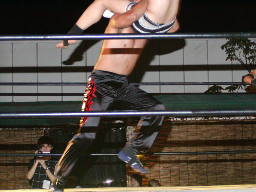 橋本バック取るとジャーマン。もう一発投げて(左写真)カバー、MIKAMIがカット。GENTARO入ってチョップ連打、倒すとエプロンに出てスワンダイブプレス、佐々木にタッチ。