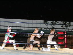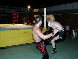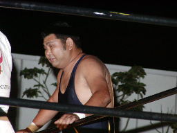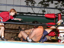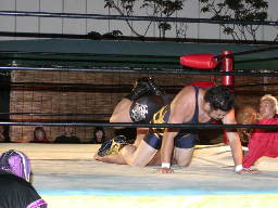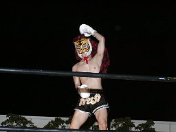虎のマスクをかぶった鳥羽がコーナーポストでポーズ(左写真)。「タノムサク戸田」に続く第2弾「タノムサク虎」?大家がロープに飛んで落とす。鳥羽股間強打。しかしこの時リングの金具が飛んだかなんかして鉄柱が傾きロープが緩む。