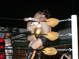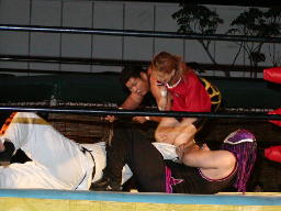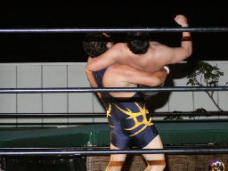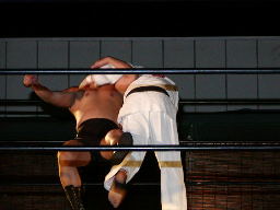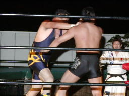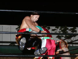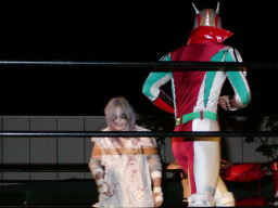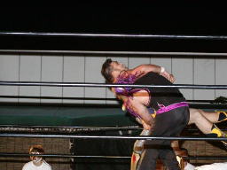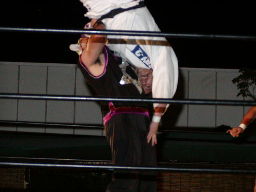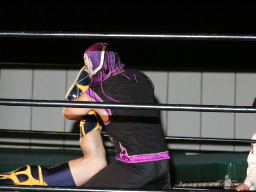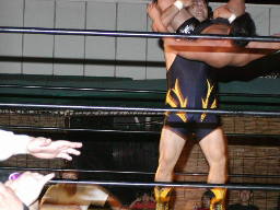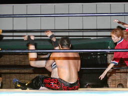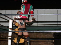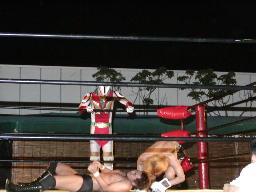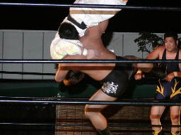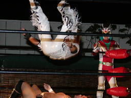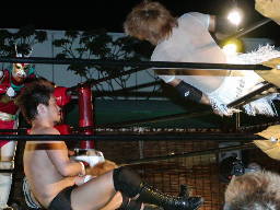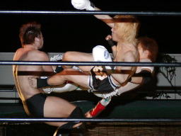 怨霊が鳥羽をコーナーに上げる、怨霊も上がるが鳥羽突き落とす。鳥羽ダイブ、怨霊下からドロップキックで迎撃(右写真)。怨霊は佐々木にタッチ。