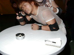 怨霊が自分らの座ってるテーブルにMIKAMIをぶつける。もっと離れた方がいいのかな、と思ってたら怨霊がVサイン。そうか写真撮らせに来たのかってことで撮るが、チャンスに弱い私は失敗(左写真)。すまぬ怨霊。