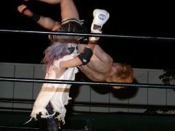 大刀光は橋本にタッチ。橋本ロープに振って肩車、カウント2。STO決めてロープに飛ぶ、藤沢パワースラム(右写真)、宇宙にタッチ。