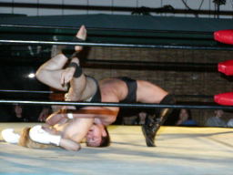 橋本コーナーに振って側転エルボー。対角線コーナーに振る、宇宙切り返して串刺しラリアット、藤沢にタッチ。藤沢足取って逆片エビ(左写真)からSTF、橋本ロープ。5分経過。
