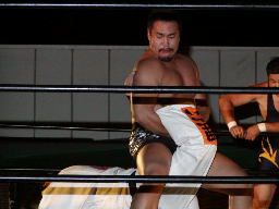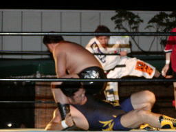 佐々木ランニングライガーボム(左写真)、カウント2。佐々木コーナーに振る、鳥羽カウンターのパンチ、MIKAMIにタッチ。佐々木ラリアット、大家にタッチ。10分経過。