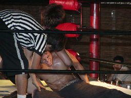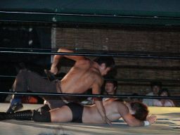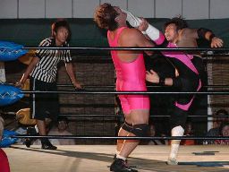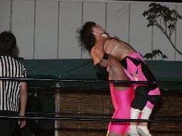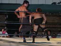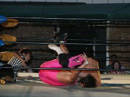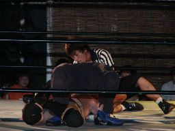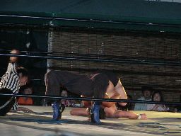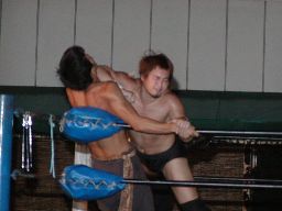 GENTAROロープに振る、坂井キック入れてカナディアンバックブリーカーに(右写真)。GENTAROロープを蹴ってリバース、カウント2。GENTAROスワンダイブプレス、カウント2で坂井を引き起こす。
