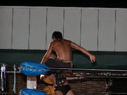 GENTAROリングに戻すとコーナーからミサイルキック、カウント2。首投げ、セカンドコーナーに上ってダイビングエルボードロップ(左写真)。