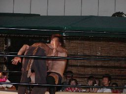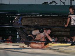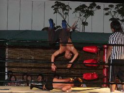 大家突っ込む、ハブ影ソバット、カカト落とし(左写真)からコーナーに上げる。大家は突き落とす。ハブ影もう一度上がって雪崩式ブレーンバスター、カウント2。ハブ影ロープに振ってバックスピンキック、カウント2。