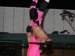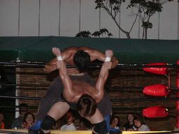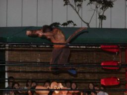 ハブ影は大家にスライディングキック、助走付けてトペ・コン・ヒーロ(右写真)、さらに場外でキック連発。