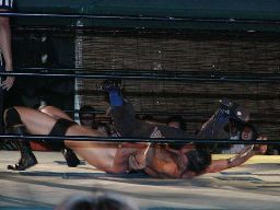 GENTAROコーナーに振って串刺しエルボー、対角線コーナーに振ってフォーク攻撃、坂井ブロック(右写真)。坂井はすくい投げでGENTAROを投げると取り上げたフォークを折って捨てる。この辺ブッチャーvsローデスがモチーフ?坂井ロープに振ってエルボー、ボディスラム2発。