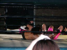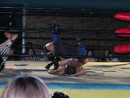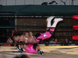 大家バック取る、ハブ影切り返してハイキック、延髄蹴り。大家がロープにもたれる、ハブ影マチュ・ピチュ(左写真)、ジャパニーズレッグロールに持ち込むがカウントは2。ハブ影パンチ、コーナー出る、大家スピアー。10分経過。