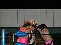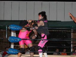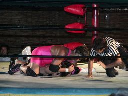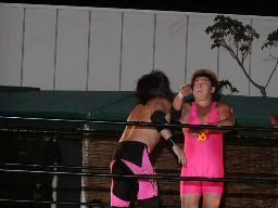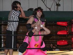 リングに戻すとコーナーに振ってダブルニーアタック(左写真)、対角線コーナーに振ってもう一発、ハブ影モンキーフリップで投げてトラースキック、カウント2。5分経過。