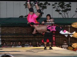大家ジャーマン(左写真)、カウント2。もう一度バック取る、ハブ影急所蹴りからバック取る。