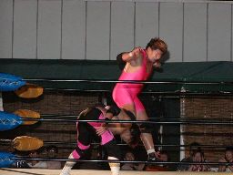 ハブ影ボディスラムからコーナーに上ってダイビングダブルニードロップ(右写真)、カウント2。
