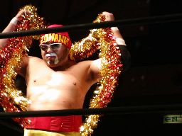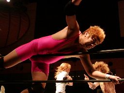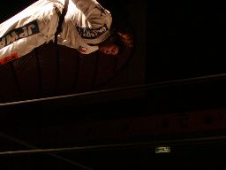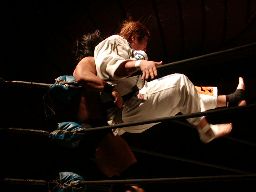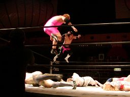 レッグドロップ、高木かわす(左写真)。腰にダメージを受けた一宮を高木は難なくオーバー・ザ・トップロープで場外に放り出す。一宮退場。