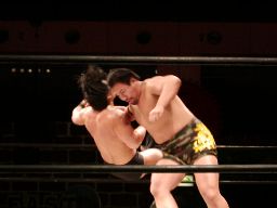 蛇影は高木に突っかかっていく。藤沢と橋本はラリアットの打ち合い(左写真)。橋本ロープに飛ぶ、藤沢パワースラム。