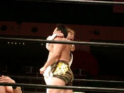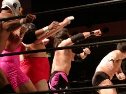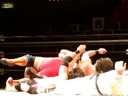 ポイズンは佐々木、GENTAROにヘッドロックパンチ連発。しかし橋本にヘッドロックをかけた際にみんなヘッドロックでつながる(右写真)。橋本が河津落とし、全員転ぶ。