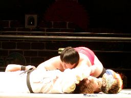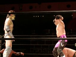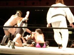 藤沢は佐々木をコーナーに振って串刺しラリアット、GENTAROが後方から飛びついて回転エビ固め(右写真)、カウント3。藤沢退場。