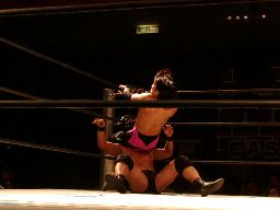 3番目の入場は橋本。高木をコーナーに振って側転エルボー(右写真)。