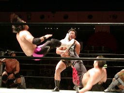 佐々木はとりあえずGENTAROを救出。藤沢をダブルでロープに振ってキック、サンドイッチドロップキック(左写真)。ダブルのクローズラインは藤沢ブレークして2人にラリアット。