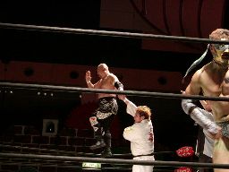 13番目に入場はトグロ・ハブ影。コーナーに上ると、なんとポイズンにミサイルキック。エプロンに出たポイズンにトラースキックで場外葬(右写真)。さらにトップロープ越しのトペ・コン・ヒーロで追撃。これにより自らも失格。蛇影もトップロープを越えて仲裁に入る。これで蛇界転生が全員消えた。3人+ヘビダーで大乱闘。ついに蛇界転生が分裂か?
