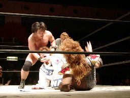 橋本にはモンゴリアンチョップ(右写真)から手刀。高木にはコーナーに詰めての逆水平。高木モンゴリアンチョップで反撃。倒れた藤沢を橋本がカバー、高木がカット。5番目の入場は蛇影。5分経過。