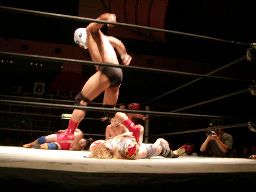 コーナーに上ってトペ・アトミコ(左写真)、カウント2。コーナーに振ってスプラッシュ、高木かわしてフェースバスター。オーバー・ザ・トップ狙う、橋本ブロック。高木はロープに橋本の首を掛けてヒップドロップ、カウント2。4番目の入場は藤沢。