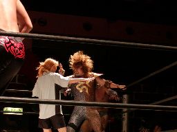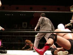 佐々木は蛇影をロープに固定して股間にドロップキック(右写真)。そこにポイズン入場。