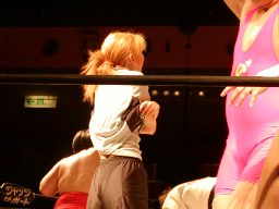 一宮は橋本の腕を取ってロープ渡り(左写真)。太がロープ揺らす、一宮エプロンに。太体当たり、一宮場外転落、失格。