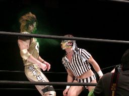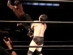 ポイズン逆水平から「Wooooooo!」高木が「面白そうだな」と代わる。逆水平(右写真)、観客「Boooooooooo!」高木ボディスラムからカバー、カウント2。高木ブレーンバスター、HERO!着地して延髄蹴り、ハブ影にタッチ。