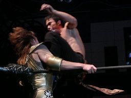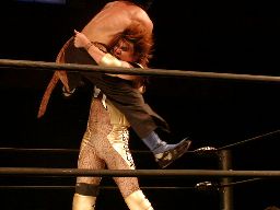 ポイズンはハブ影の口にフォークを突き立てる(左写真)。これは痛そう。いや、フォーク攻撃はどれでも痛いんだろうけど、これは特にヤなものがある。ハブ影ミドルキックで反撃するがポイズンはキャッチしてネッシー、カウント2。高木にタッチ。10分経過。