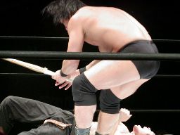 HERO!コーナーに上って片足ミサイルキック、コーナーに振ってHERO!キック。対角線コーナーに振る、高木かわしてラリアット、カウント2。高木コーナーに振って串刺しエルボーからリバーススプラッシュ式エルボードロップ(左写真)、カウント2。