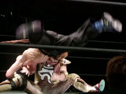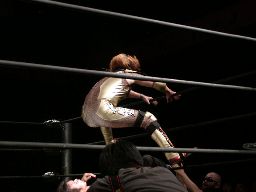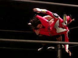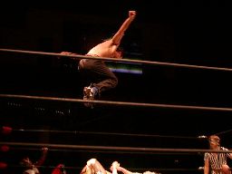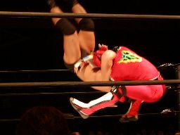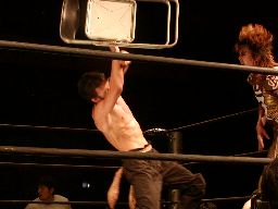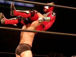 HERO!コーナーに上る。高木も起き上がってコーナーに上る。HERO!はパンチ入れて高木をコーナートップに座らせると飛びついて雪崩式ウラカン・ラナに(左写真)、カウント2。15分経過。