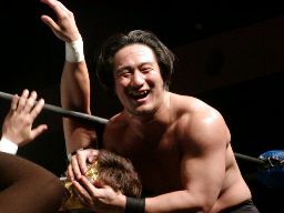 高木サンダーファイヤーパワーボム(右写真)、カウント2。バック取る、HERO!ロープに逃げるが高木強引に投げっぱなしジャーマン。