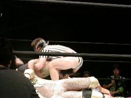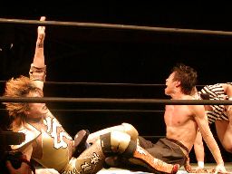 HERO!再度コーナーに上る。高木追う、HERO!落としてダイブ、高木空中でキャッチしてスタナー(右写真)、カウント2。両軍タッチ。
