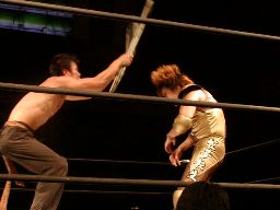 ハブ影延髄蹴り、ポイズン場外転落。ハブ影トペ。ポイズンはイスを持って戻る。ポイズンハブ影にイス攻撃(左写真)。
