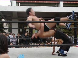 鳥羽コーナーに上って「ウィーン!」。エプロンに出ると「タノムサクキーック!」(スワンダイブの片足キック)、カウント2。鳥羽ヒザ蹴り、ボディ連打、ロープに飛ぶ、太キック、カカト落とし、ギロチンドロップ、カウント2。コーナーに振ってスプラッシュ(右写真)、DDT、カウント2。