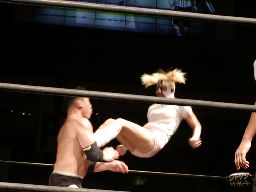 O.K.コーナーに振る、佐々木ラリアット。鳥羽が宇宙を場外に釘付けにする間に佐々木はD-ガイスト(右写真)でO.K.をフォール。