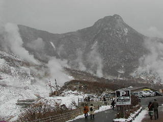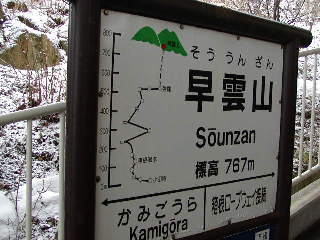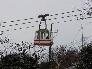 そしてケーブルカーの終点・早雲山駅に。標高767m。本来ならここから箱根ロープウェーに乗り換えるところが、現在架け替え工事中のため代行バスで大涌谷まで行かなきゃロープウェーには乗れない。ところが、急に降りだした雪による渋滞と事故のため係員いわく「大涌谷に何時に着けるかわからないが、ロープウェーの最終運転時刻16時に間に合わないのは間違いない。」この時点で3時半、代行バスは10分で大涌谷に着くはずなのだが・・・・「大涌谷にどうしても行かれたい方以外は戻られたほうが・・・」とはっきりしない止め方の係員。自分はさっさと戻ることを決めるが、近くにいた外人カップルがなかなか納得しない。係員と一緒に説得するが男のほうが頑固。なんでも今日中に東京まで戻る予定らしい。最終的にはあきらめてケーブルカーに乗ってたが。