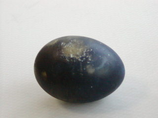 大涌谷の名物・黒タマゴ。見た目燻製卵か烏骨鶏の卵に見えるが、周りの黒はカラに硫化鉄がくっついたもので、中はただのゆで卵だった。がっかし。