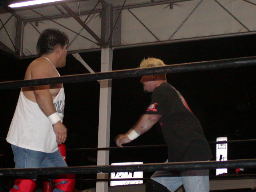 序盤はロープワークからのタックル合戦(左写真)、チョップ合戦。しかしすぐに戦場は場外に。雨の中観客席に互いを投げ込む。