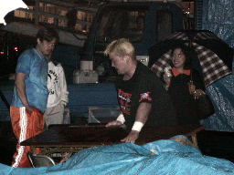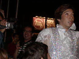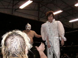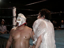 正規軍の入場からちょっと遅れてゴージャス入場(左写真)。ゴージャスがコールされる間に場外乱闘で試合開始。雨は上がった。