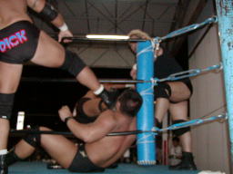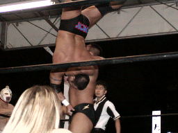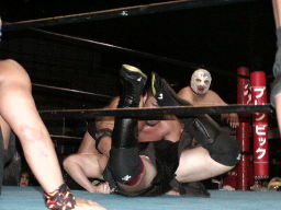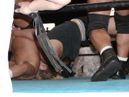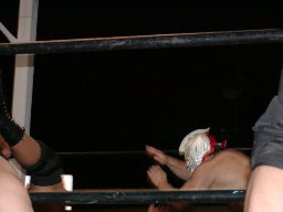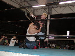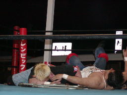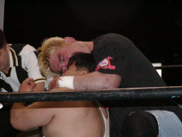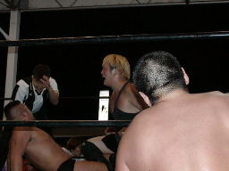 東郷ブレーンバスター、カウント2。ペディグリー(右写真)からセントーン狙ってコーナーへ。松田が阻止しようとする。が、一宮に捕まって引きずり下ろされる。