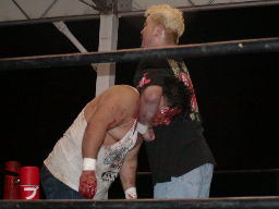 一宮はゴージャスにボディスラム3連発。声も出なくなるゴージャス(左写真)。売店に連れて行き缶ビールを頭からぶっかけた様子。