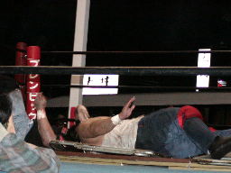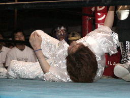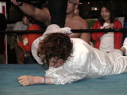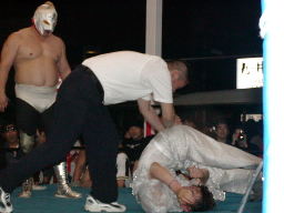 突っかかるゴージャス、しかし浅野社長はあわてずゴージャスをマットに転がす(右写真)。